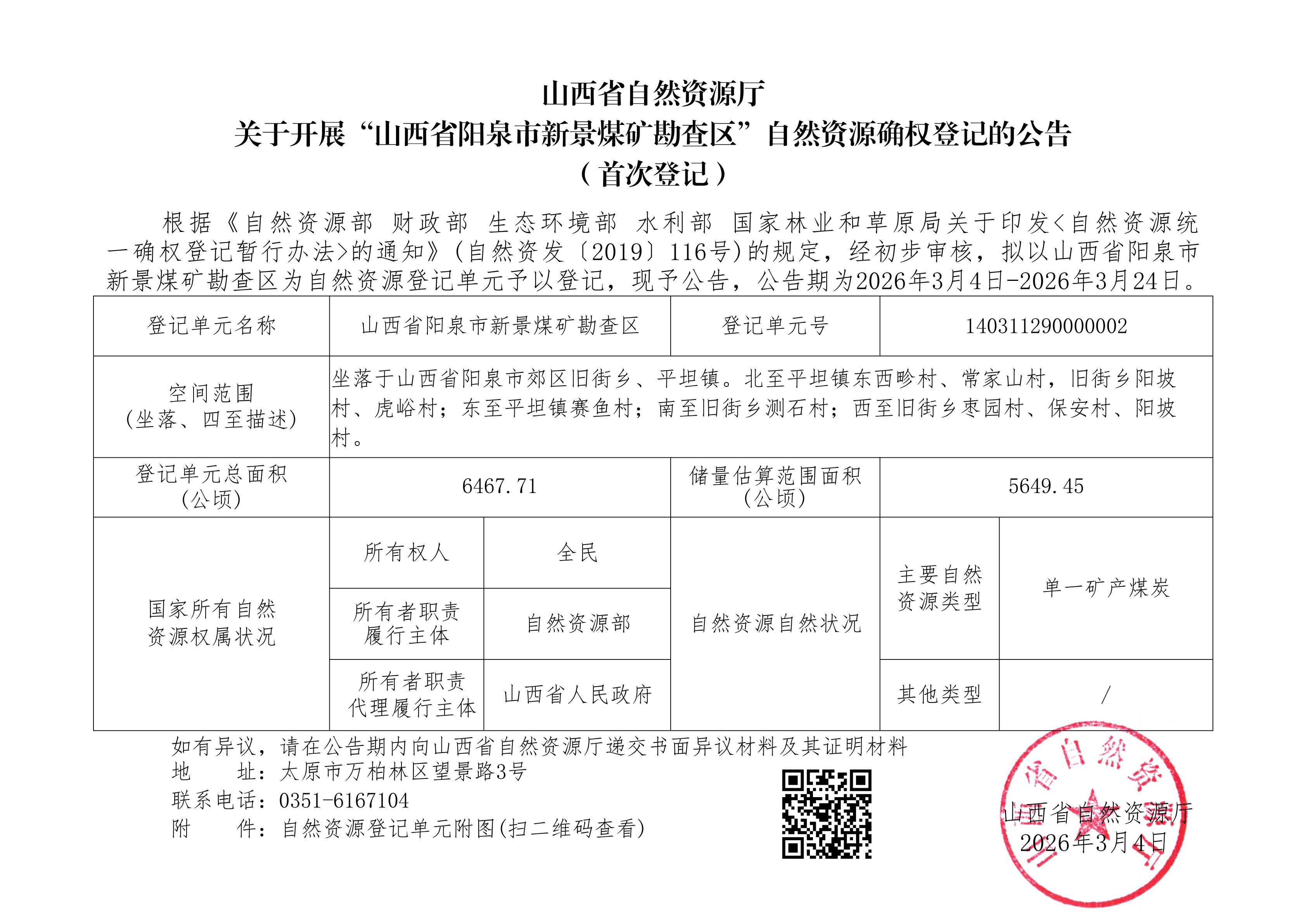 山西省阳泉市新景煤矿勘查区自然资源确权登记的公告(首次登记)