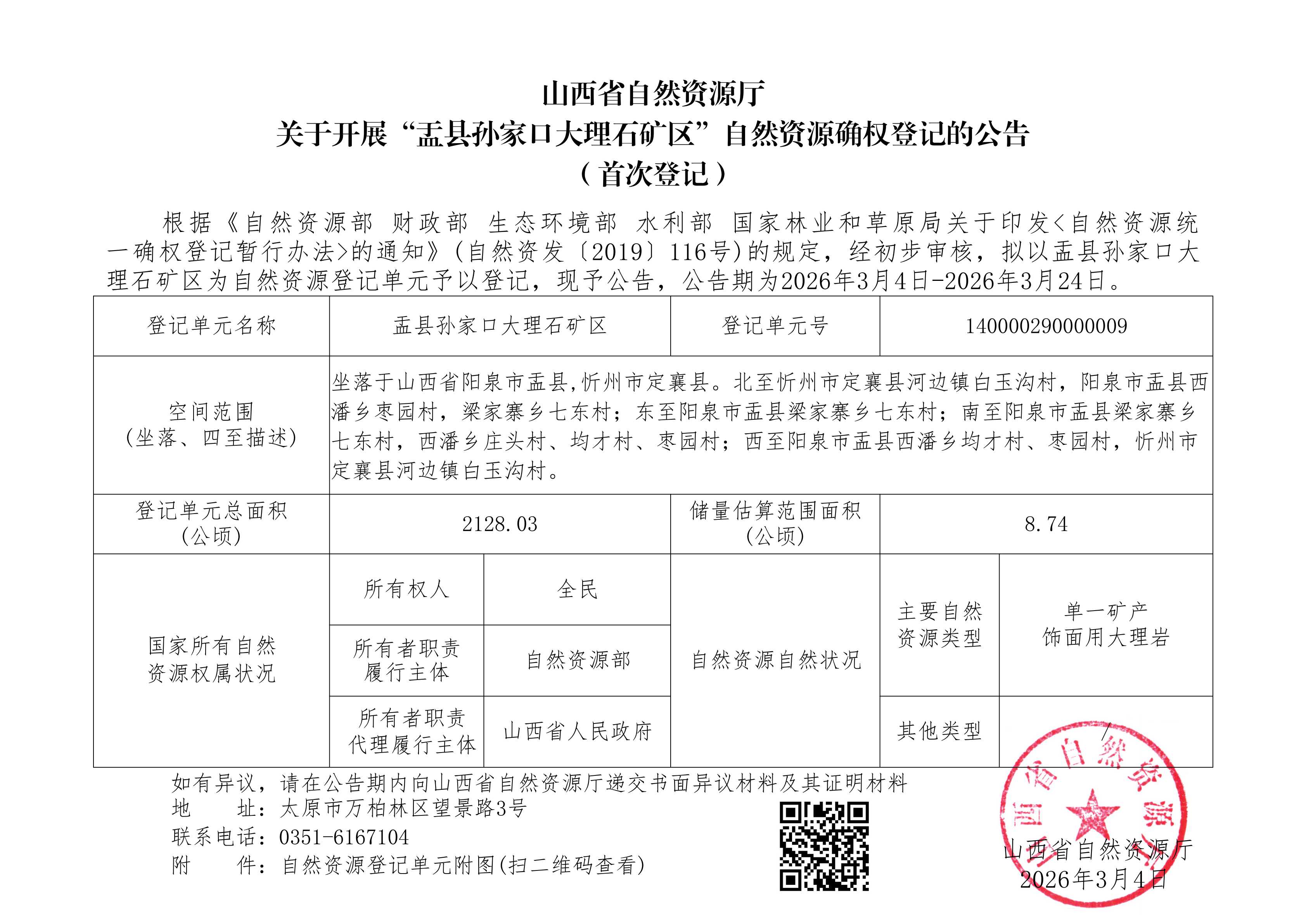 盂县孙家口大理石矿区自然资源确权登记的公告(首次登记)
