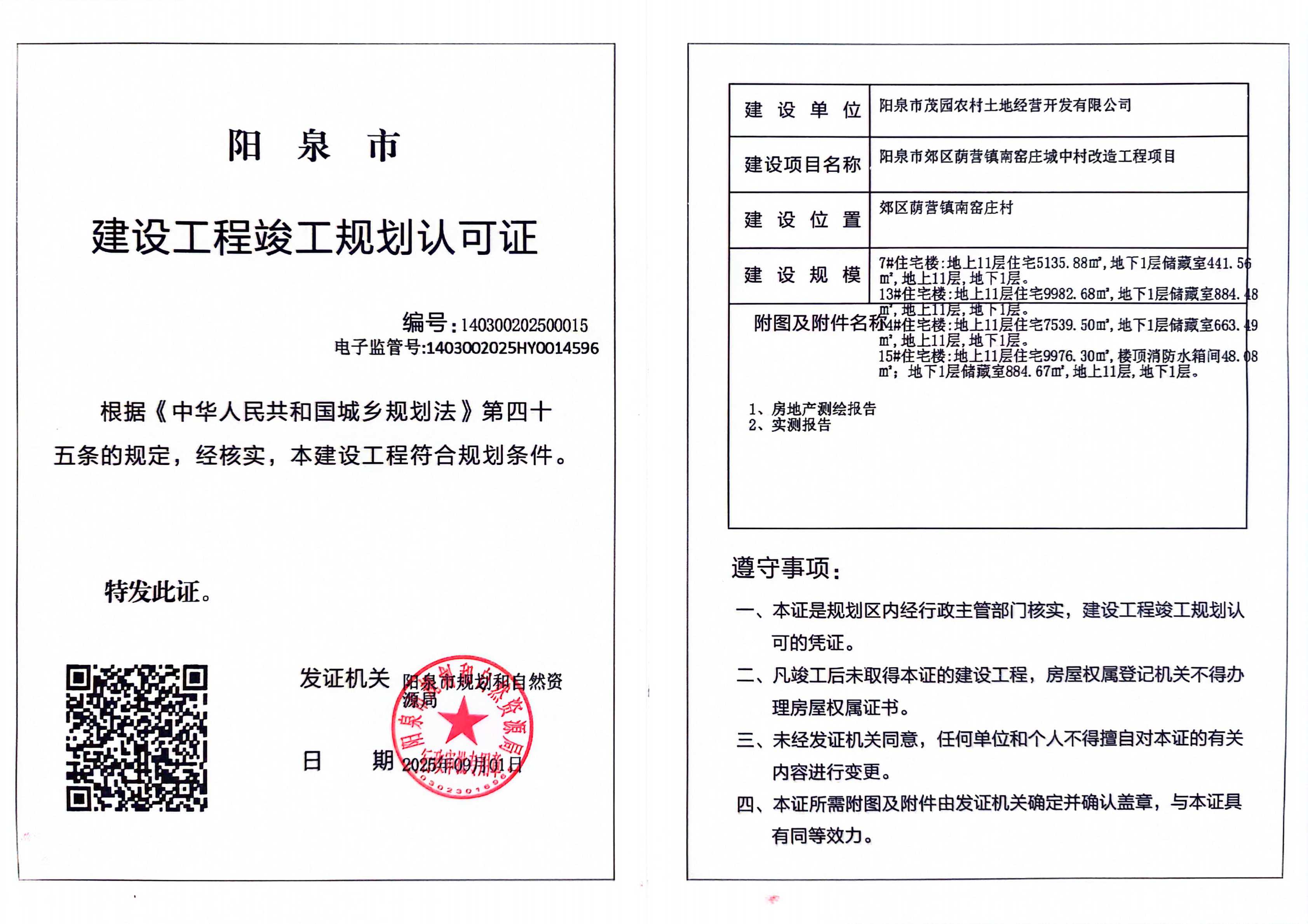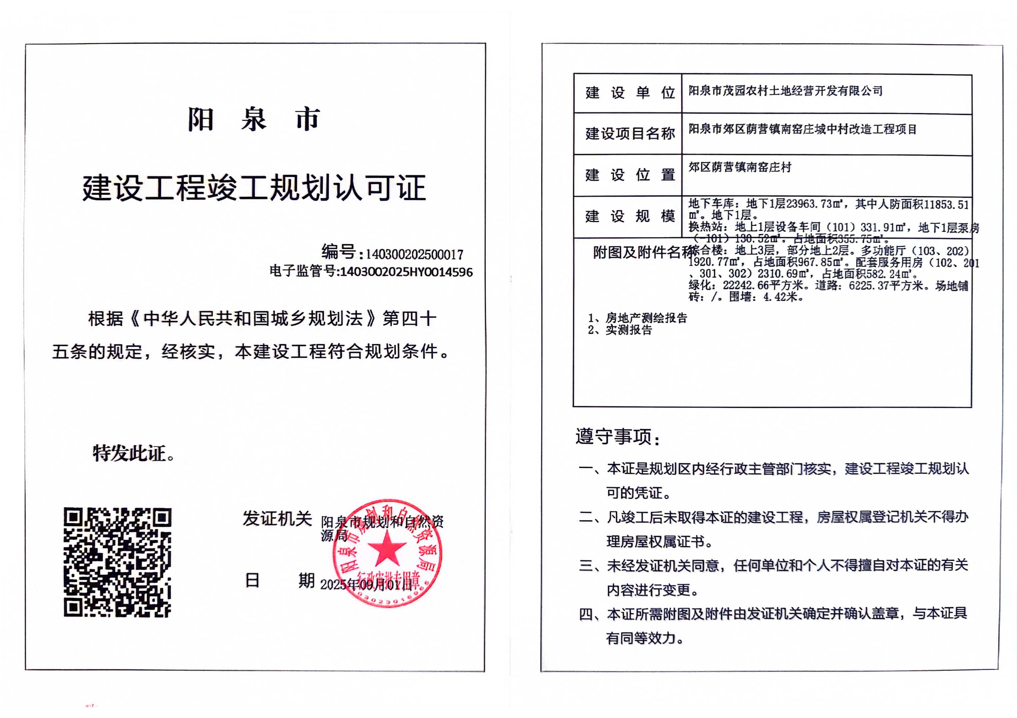 阳泉市郊区荫营镇南窑庄城中村改造工程项目建设工程竣工规划认可证