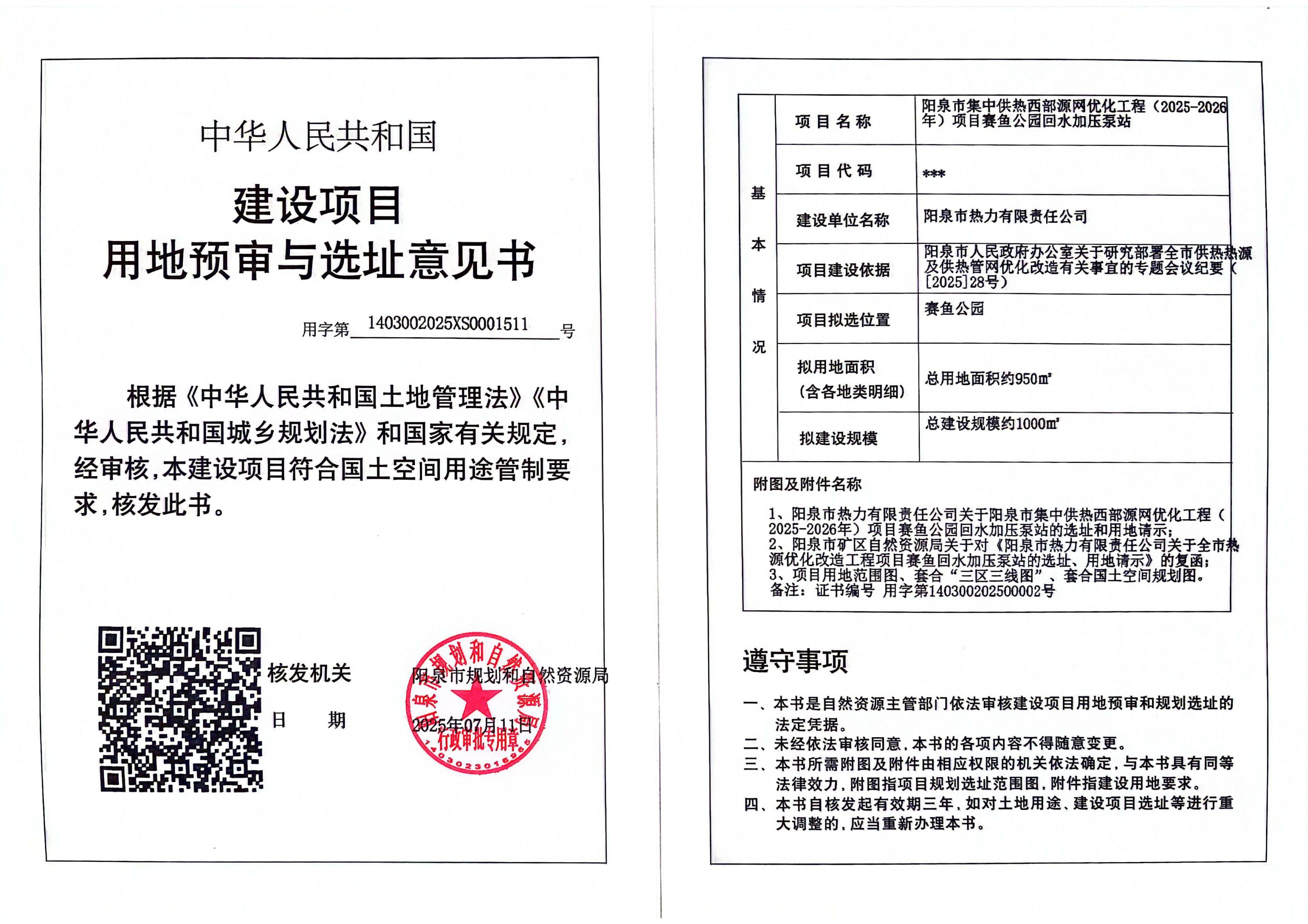 阳泉市集中供热西部源网优化工程(2025-2026年)项目赛鱼公园回水加压泵站