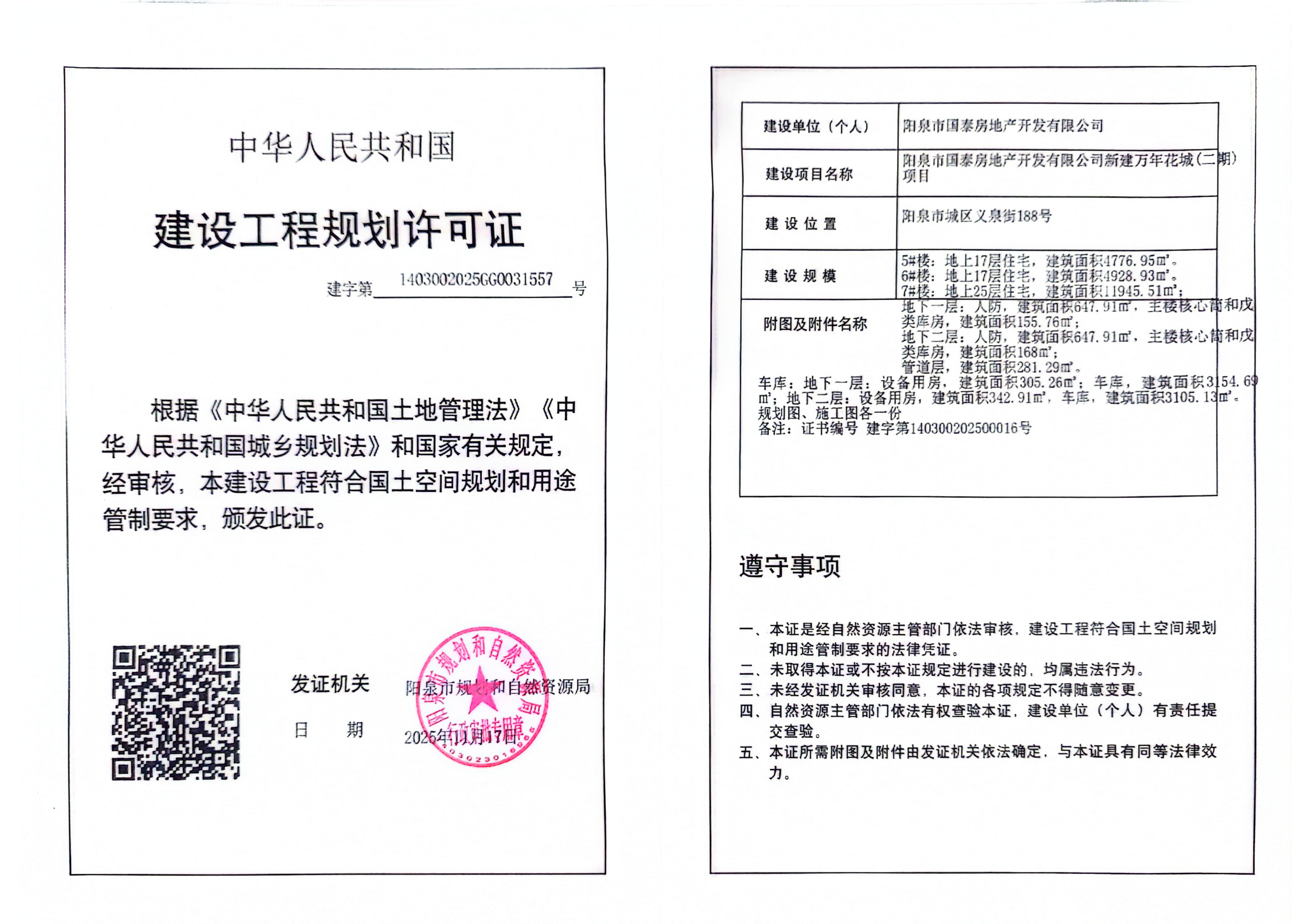 阳泉市国泰房地产开发有限公司新建万年花城(二期)项目建设工程规划许可证