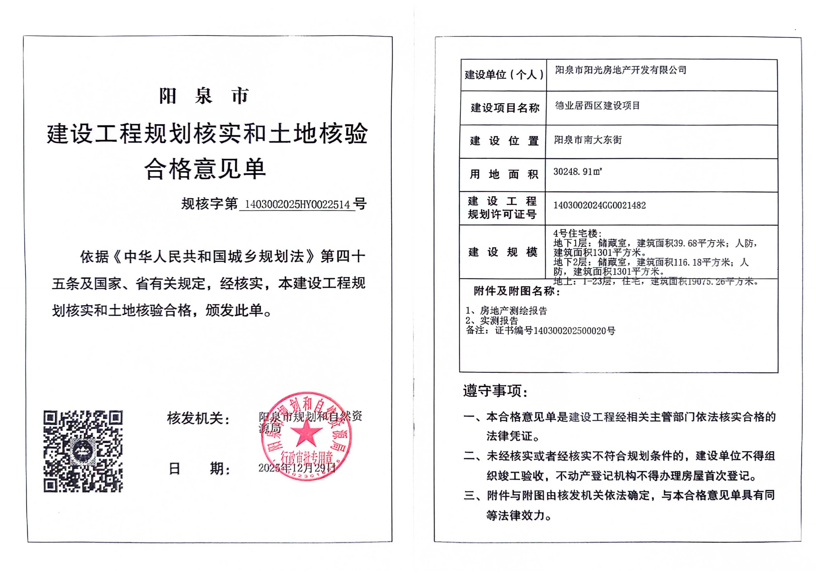 德业居西区建设项目建设工程规划核实和土地核验合格意见单