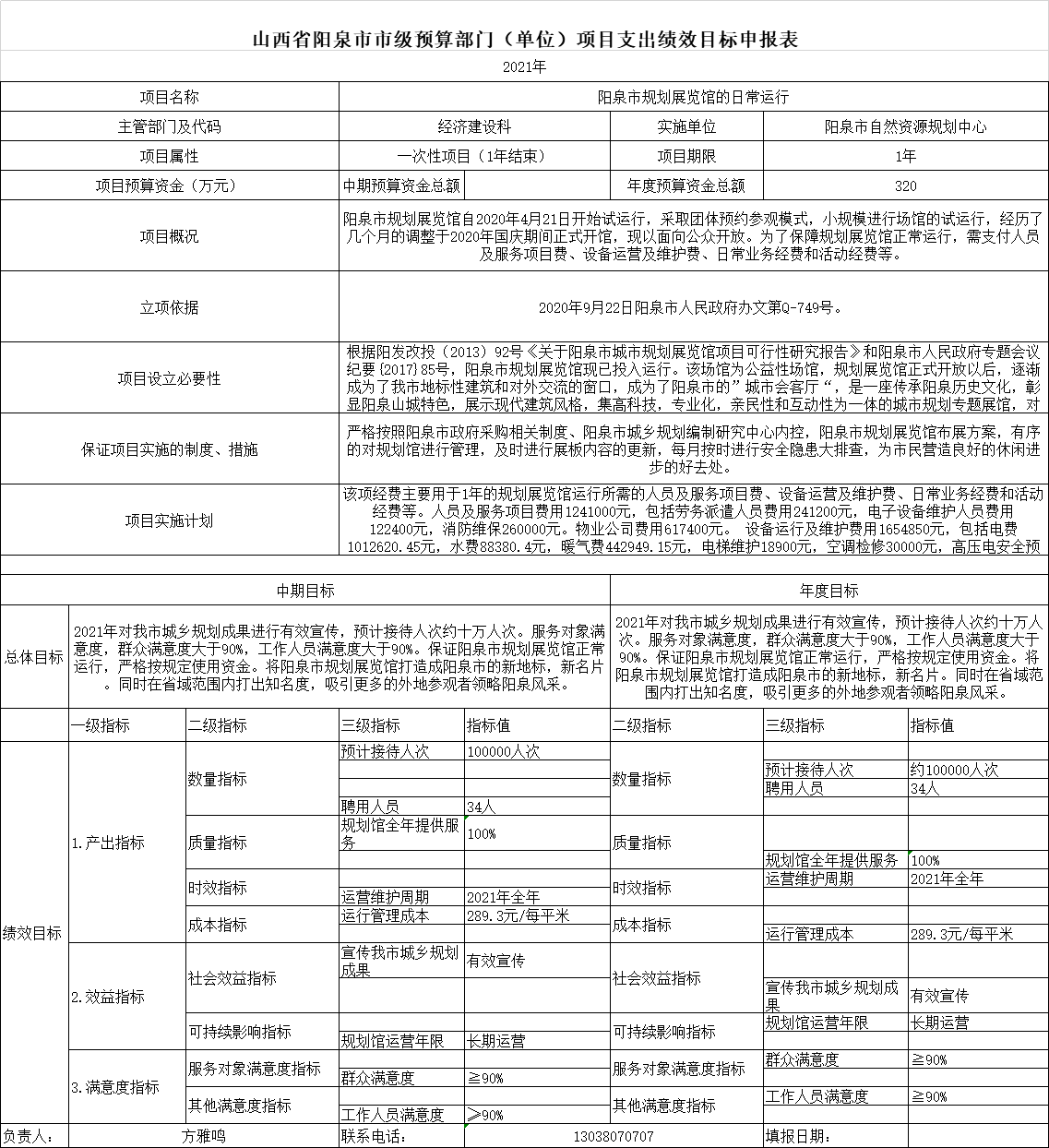阳泉市规划展览馆经费主要用于一年的规划展览馆运行所需的人员及服务项目费、设备运营及维护费、日常业务经费和活动经费等。人员及服务项目费用1241000元,包括劳务派遣人员费用241200元,电子设备维护人员费用122400元,消防维保260000元。物业公司费用617400元。 设备运行及维护费用1654850元,包括电费1012620.45元,水费88380.4元,暖气费442949.15元,电梯维护18900元,空调检修30000元,高压电安全预防试验费32000元,网络通信费30000元。日常业务经费228950元,包括消耗品47850元,讲解员扩音器1500元,宣传印刷费9600元,展示内容维修费60000元,馆东侧绿化费用60000元,其他费用50000元。活动经费75200元,包括小小讲解员活动经费4050元,志愿者活动费用11150元,科普活动60000元。以上共计3200000元。