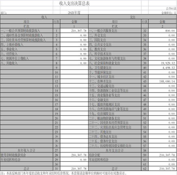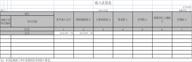 2021年度收入合计21.030778万元,其中:财政拨款收入21.030778万元,占比100%;上级补助收入0万元,占比0%;事业收入0万元,占比0%;经营收入0万元,占比0%;附属单位上缴收入0万元,占比0%;其他收入0万元,占比0%。