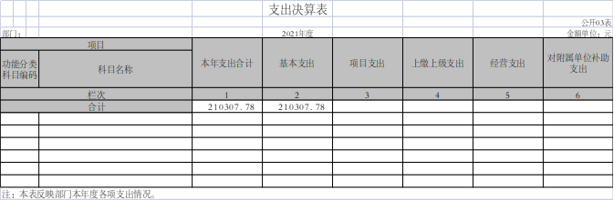 2021年度支出合计21.030778万元,其中:基本支出21.030778万元,占比100%;项目支出0万元,占比0%;上缴上级支出0万元,占比0%,经营支出0万元,占比0%,对附属单位补助支出0万元,占比0%。