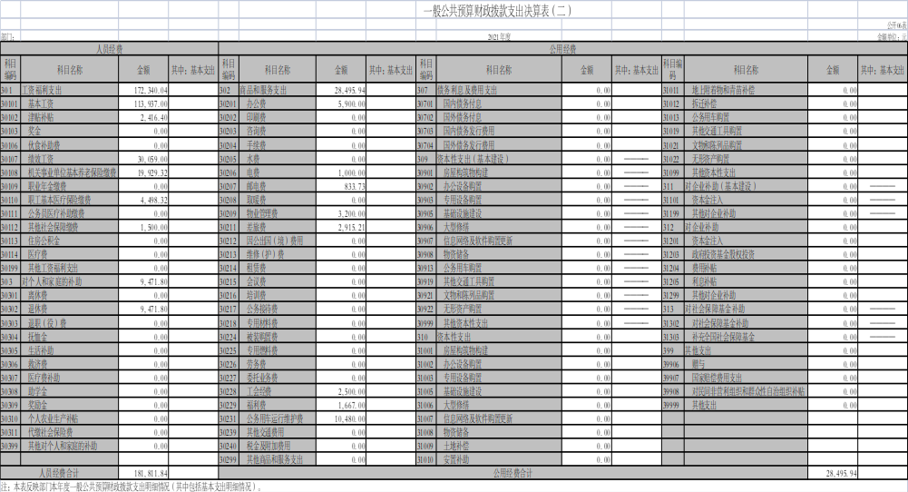 2021年度财政拨款基本支出21.030778万元,其中:人员经费18.181184万元,主要包括工资福利支出和对个人和家庭的补助;公用经费2.849594万元,主要包括商品和服务支出。