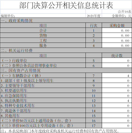 截至2021年12月31日,本部门共有车辆4辆。其中,副部(省)级及以上领导用车0辆、主要领导干部用车0辆、机要通信用车0辆、应急保障用车0辆、执法执勤用车4辆、特种专业技术用车0辆、离退休干部用车0辆、其他用车0辆;单价50万元(含)以上的通用设备0台(套),单价100万元(含)以上专用设备0台(套)。